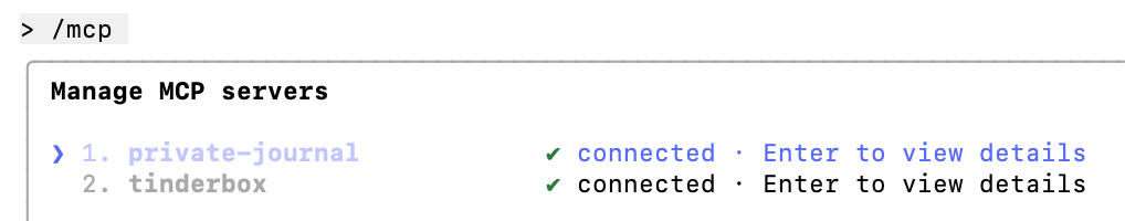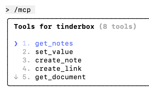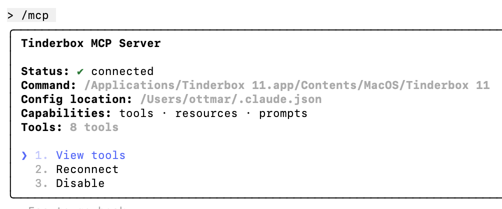 Please make sure you are comfortable with editing the files I pointed out in my first post to make sure Claude code knows about the Tinderbox MCP server. If you start claude in a terminal it will tell you about syntax errors you may have introduced. If that succeeds you can ask it for the MCP servers it knows using the “/mcp” command.. In my case I see: