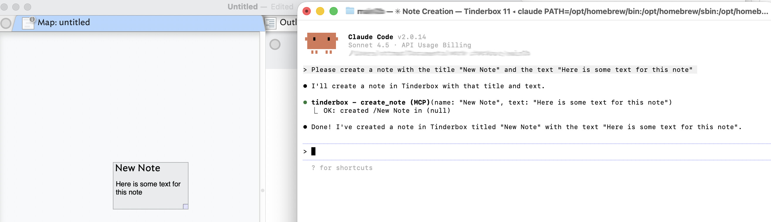 I have the free version of Claude Desktop and thus I do run out of tokens more often that I’d like. However, I do have an api key from Antrhopic that I use with Claude code and DEVONthink. I figured I try to use Claude Code with Tinderbox by simply copyig the MCP server entry that was part of the file ~/Library/Application Support/Claude/claude_desktop_config.json (installed by Tinderbox 11) and add it to the ~/.claude.json file. The latter being used for Claude Code. Surprisingly, that gave me access to Tinderbox through Claude code. Here is my first interaction simply asking to create a note: