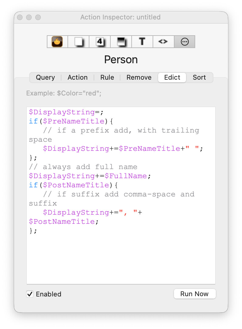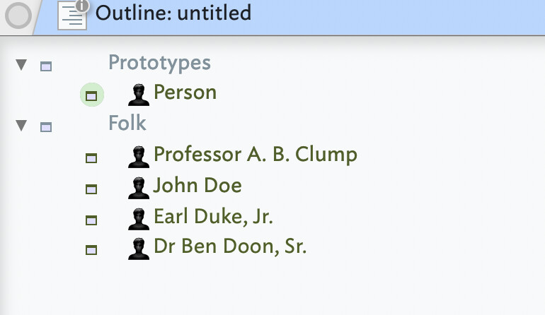 In a Tinderbox file that contains many persons of prototype pPerson, I have the attributes $FullName, $PreNameTitle (such as “Prof.” or “Baroness”) and $PostNameTitle (such as “MP” or “MdB”).