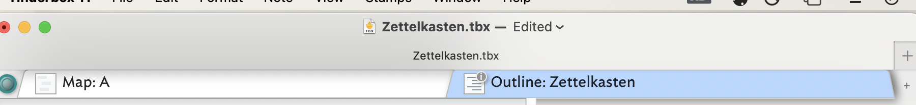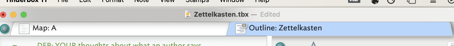 In your grab we can see your document has two tabs âMap: Aâ and âOutline: Zettelkasternâ. The first part of the tabâs label indicates the view type (as does the tabâs icon). The part of the label after the colon is the name of the note or agent forming the root of the view. In the case of a Map, the view shows the children of the displayed note/agent. So, the first tab is showing the contents of the note/agent called âAâ. In the case of the Outline tab the container is the same as the note name indicating the view is at document root scope (the default in a new document).