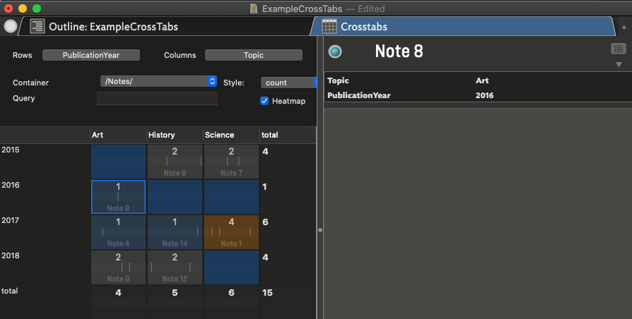 Ok - here is a contrived example. I’ve created 15 notes with Displayed Attributes $Topic and $PublicationYear. The values for $Topic are randomly chosen among 3 values (“Art”,“Science”,“History”) and those for $PublicationYear between 2015 and 2018.