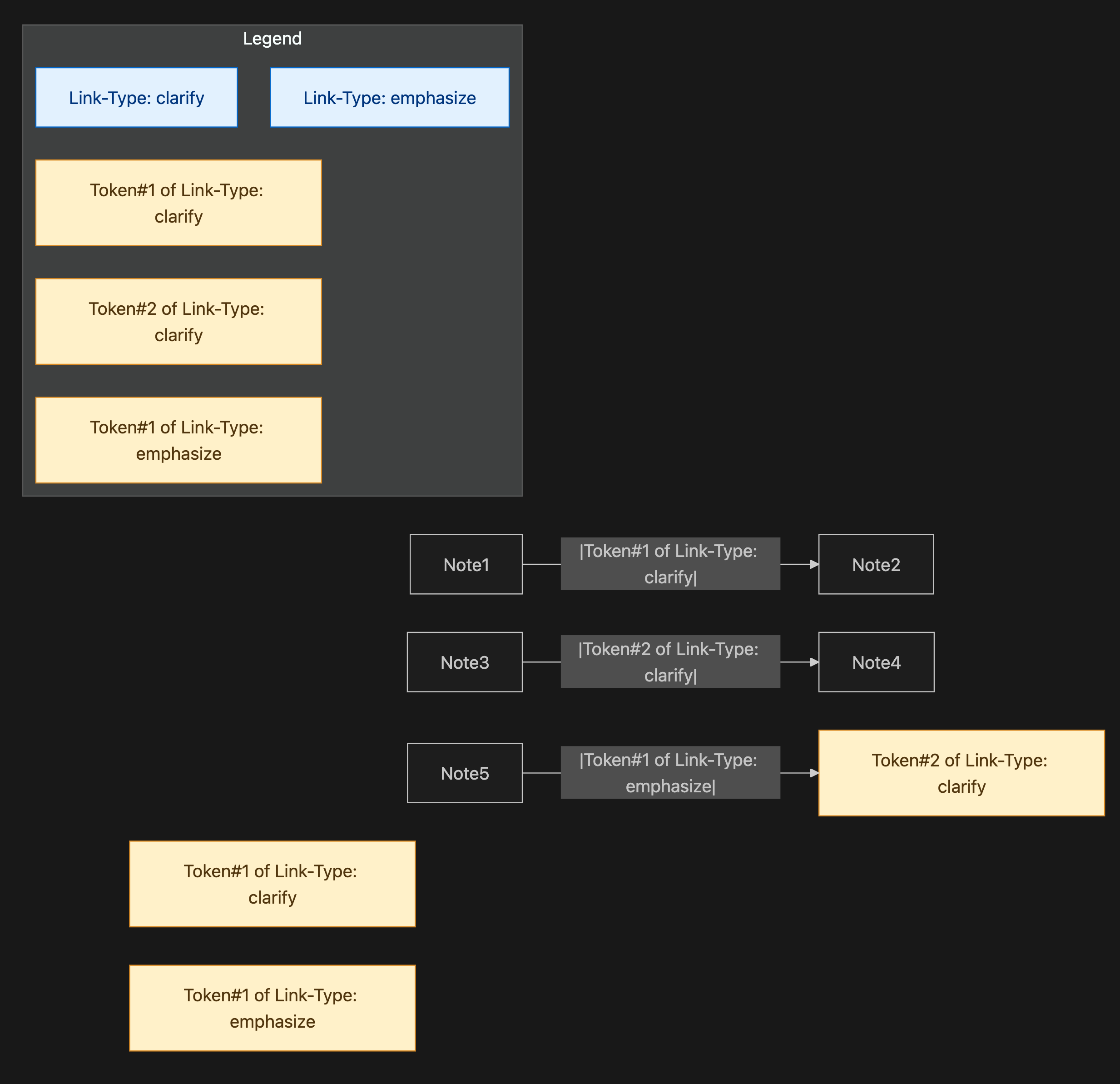 Iāll try it with just a flowchart. Maybe it will become clearer what is meant when the attempt is made. For example, being able to link a Note to a token of a link type, to emphasize that a token of a link type is itself a kind of note, which, as a token, is an individual of the more general link type.
