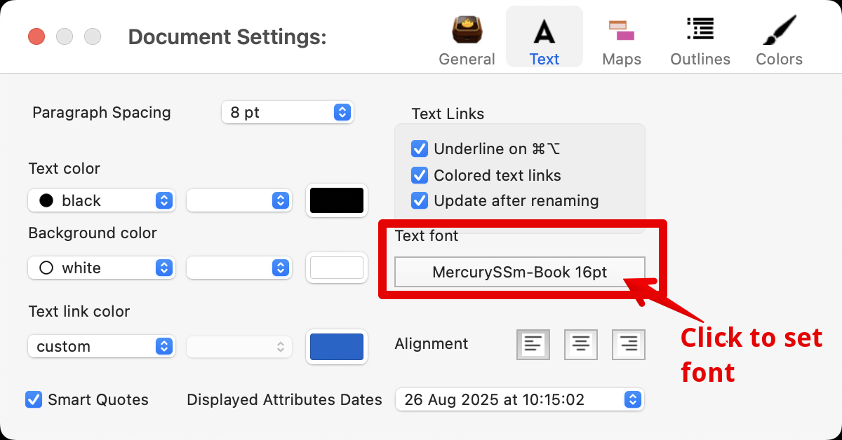 ā”. The colour of a selection of $Text can be set via the Fonts palette. The default $text colour is set in $TextColor via the Document Settingās Tab paneās text colour controls. Bold/italic are set via Tinderbox controls and use the default fontās bold-or italic face if on the host OS system. IOW you canāt set italic $Text if $TeXtFont has no italic face: same for bolding.