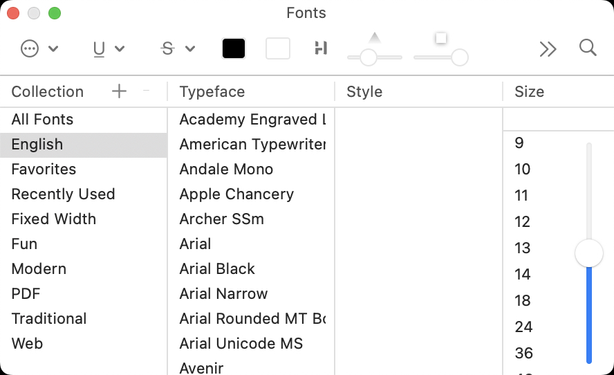 Clicking the font buttonāthat shows the current font face/sizeāopens the macOSā Fonts palette: