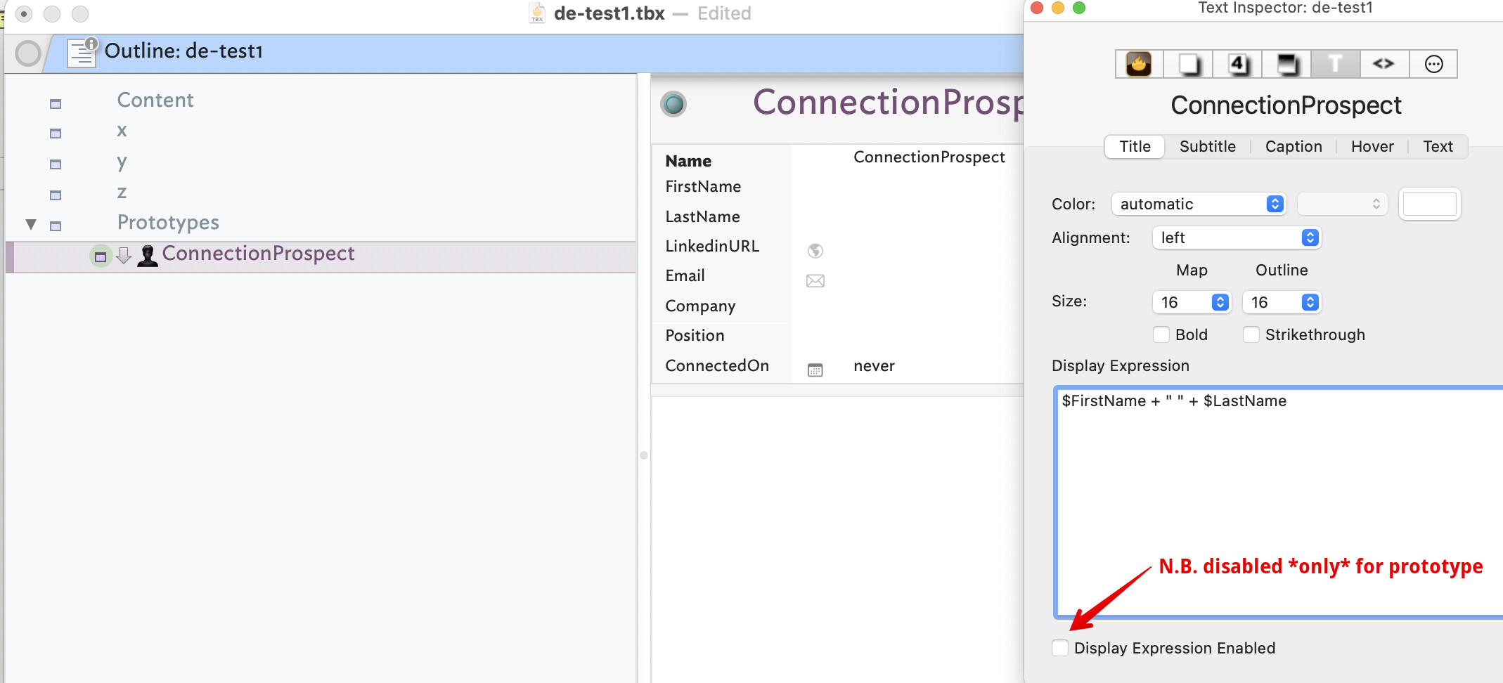 I’ve set $DisplayExpression on the ConnectionProspect prototype to $FirstName + " " + $LastName. The TSV data includes both FirstName and LastName fields with values. After import, however, $FirstName appears as the note title ($Name) rather than mapping to the $FirstName attribute, and $LastName appears as the first displayed attribute. The screenshot below shows the expression as entered — note that I had inadvertently included a trailing semicolon, which I’ve since removed, but the behavior is unchanged.