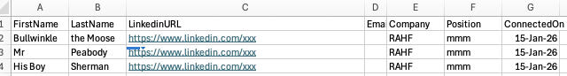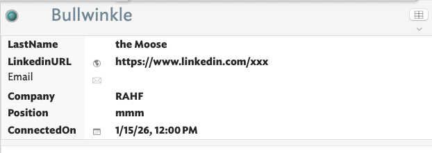 I’m importing LinkedIn connections data as a TSV by dragging it onto the Tinderbox window (11.6.0 b779). After import, I assign the ConnectionProspect prototype to the imported notes. The notes show the correct prototype name in the Properties Inspector, but they don’t display the prototype’s defined displayed attributes.