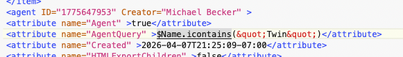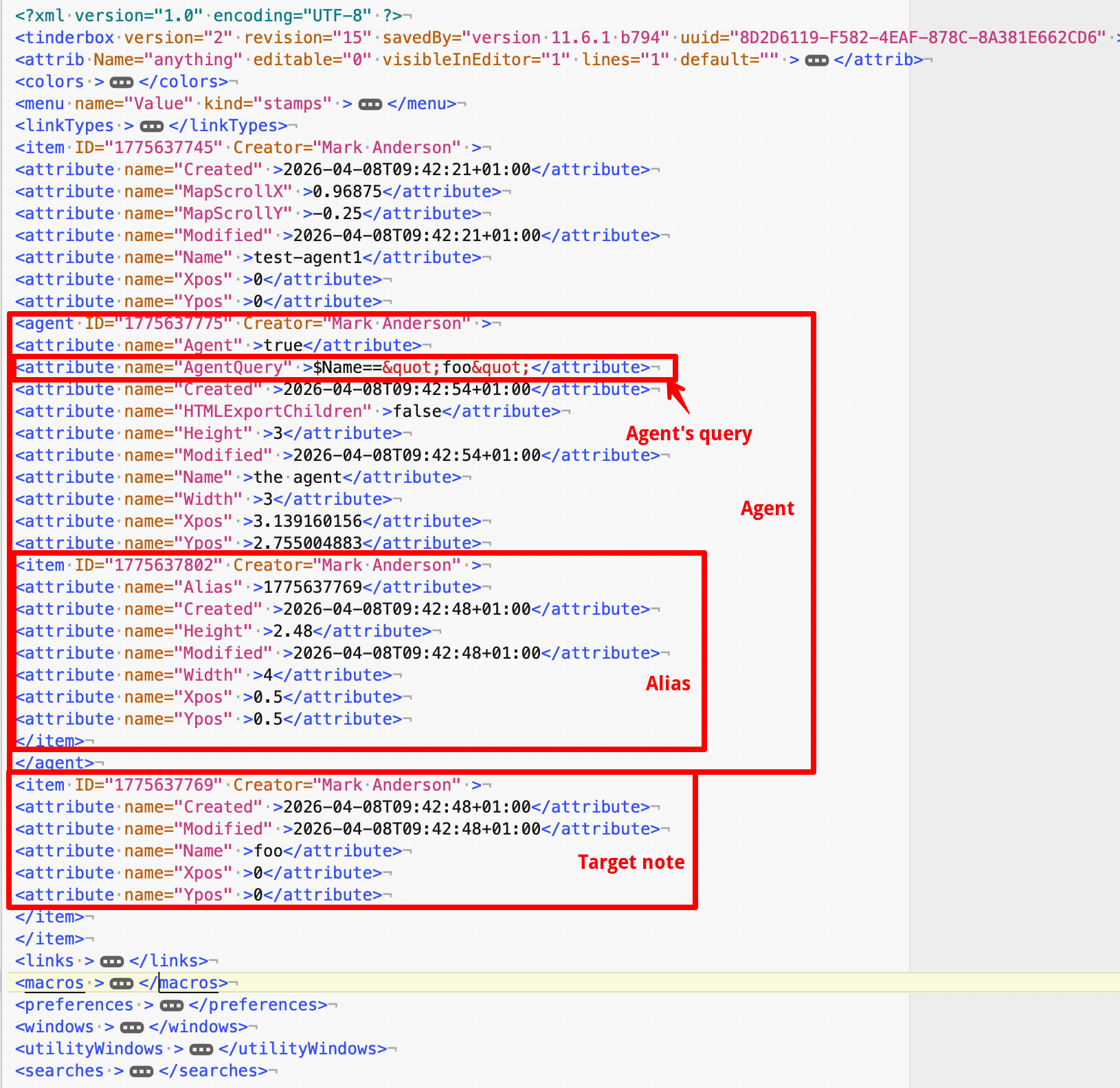 I’ve put boxes around the agent (<agent>...</agent>) element, the note 'foo' (…) at the bottom. Nested inside the agent is an <item> but note that it has no Name (attribute name="Name" >) but instead has an Alias attribute value which is the $ID of the matched note (1775637769 for alias and ‘foo’). Also marked in where the agent’s query is stored: the value of attribute AgentQuery).